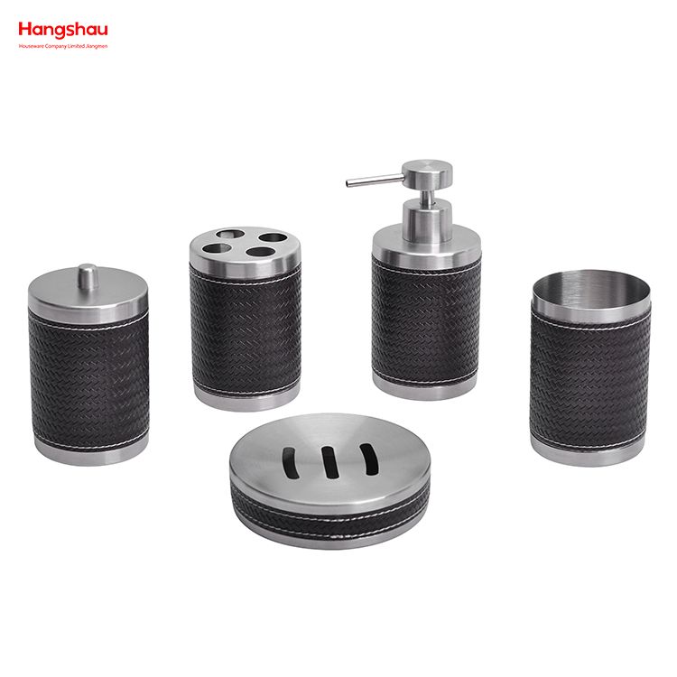 بيت / فئة المنتج / مجموعة الاستحمام / اكسسوارات الحمام الفاخرة الجلود الاصطناعية تزيين مجموعة الفولاذ المقاوم للصدأ كامل الحمام زجاجة محلول موزع مضخة رغوة زجاجة الصابون الجلود الاصطناعية